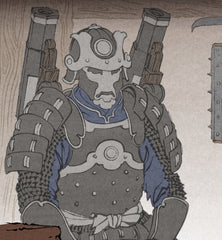 My first sketch of this character featured him in a battle-ready action pose. But then I realized that he's most at home in his workshop, surrounded by his tools.